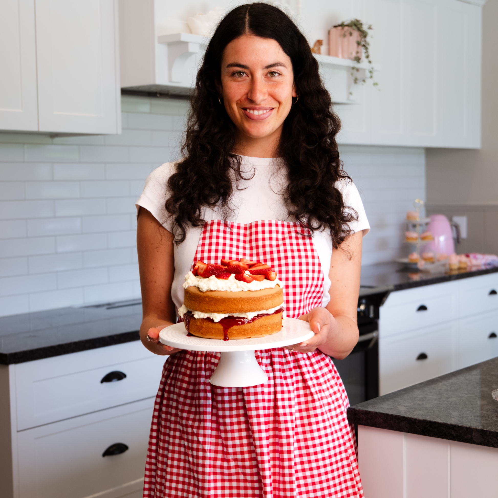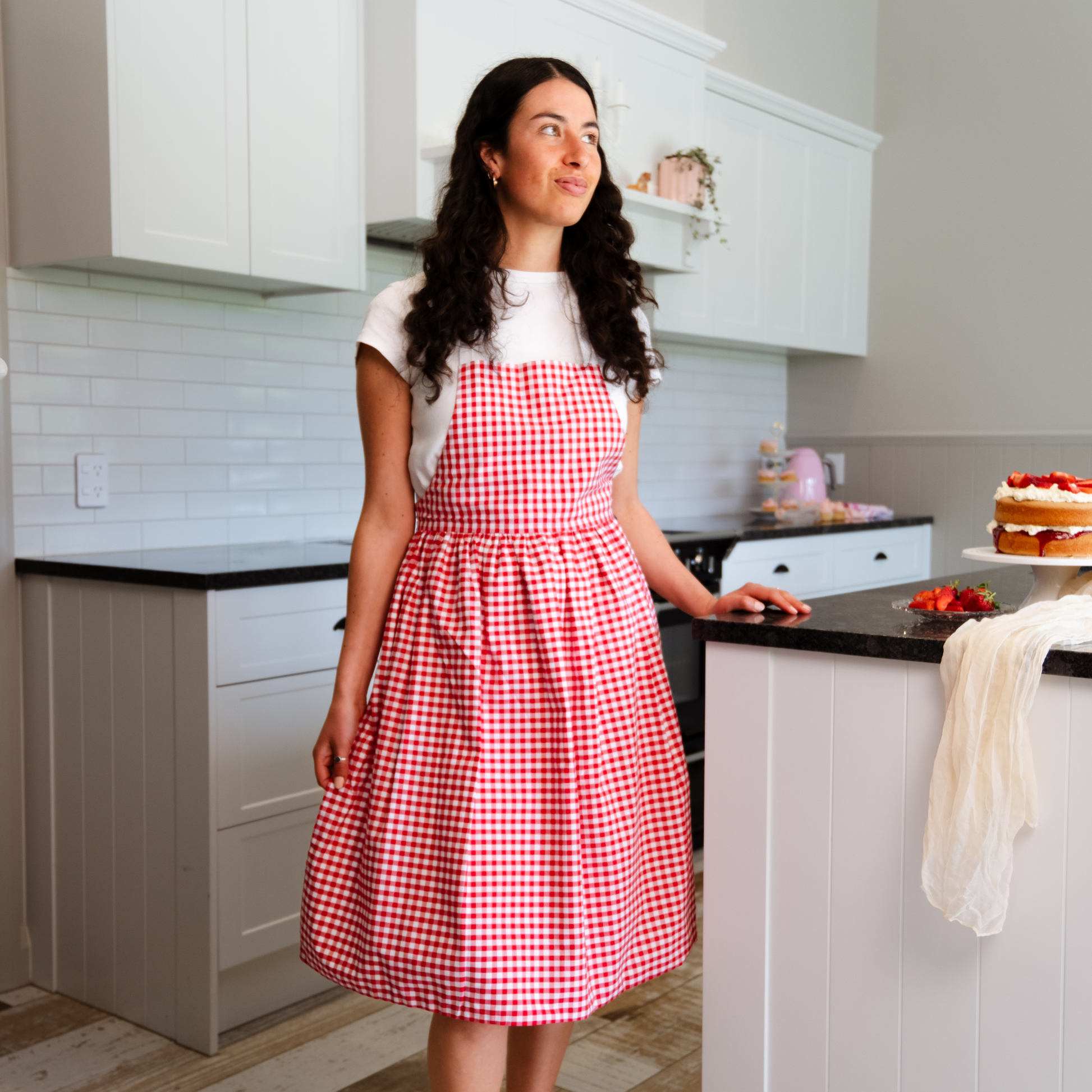 Julia is a 8-10 womenโs and is wearing the Mrs. Apron.